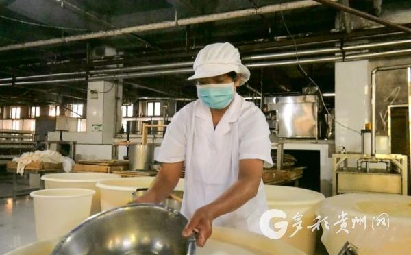 贵州省春山一巷食品有限公司工人戴芬娜说:“以前在浙江,现在回来是为了方便带孩子,就在家门口找了个班上。去年国庆节来的,到现在一年了,我们主要是包灰豆腐果、点浆和烧浆,比较轻松也很好上手,一个月工资3500元,也还可以。”